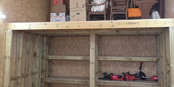Customer had an exceptionally large garage and wanted to divide off a section to store delicate items. 3.9m x 3.5m stud wall complete with OSB boarding and door. Heavy duty 3.9m x 2.3m platform built, with x6 1700mm x 600mm shelves below.